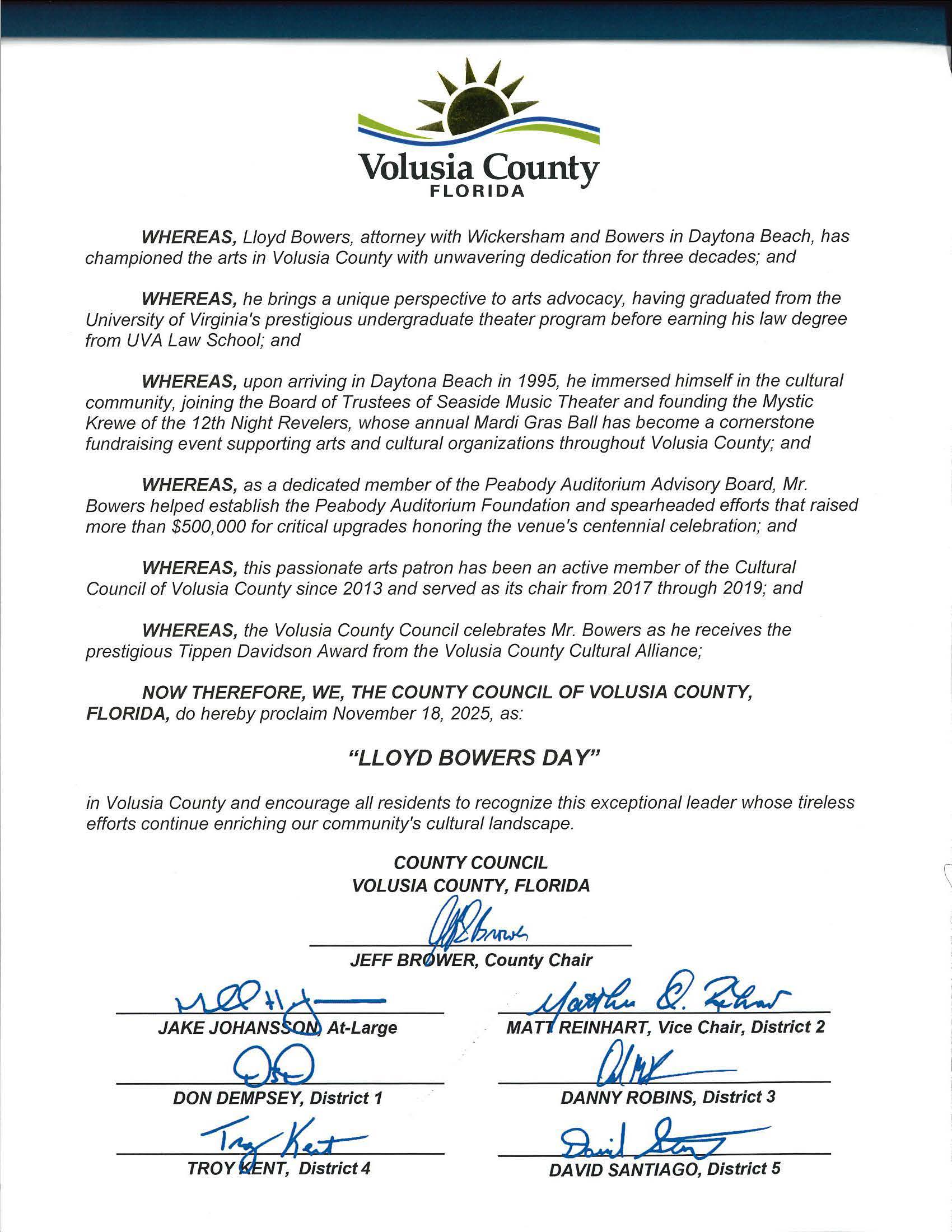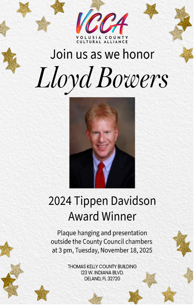 Join the Peabody Auditorium Foundation in congratulating Lloyd Bowers, PAF founder and Board Member, on receiving the Volusia County Cultural Alliance Tippen Davidson Award for the Arts. Please join us to honor Lloyd at the plaque hanging and presentation on November 18 at 3:00pm!